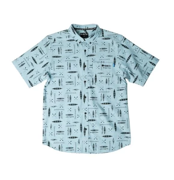 Casual fit, short sleeve button up, button-down collar with interior KAVU logo jacquard tape, single chest pocket with button closure, 25% certified recycled polyester faux wood buttons, back bias cut yoke with center back box please, curved hem.